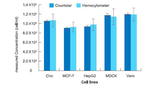 Countstar细胞计数仪与血球计数板分别对CHO、MCF-7、HepG2、MDCK、Vero细胞计数细胞浓度,两种方法计数结果一致,Countstar细胞计数仪计数结果更准确,重复性测量标准偏差更小