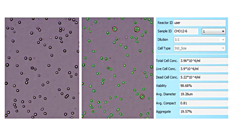 无台盼蓝染色时,Countstar细胞计数仪可以准确检测细胞浓度、细胞平均直径、细胞平均圆度和细胞聚团率,CHO细胞计数,绿色圈所示为有效计数细胞。