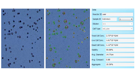 无台盼蓝染色时,Countstar细胞计数仪可以准确检测细胞浓度、细胞平均直径、细胞平均圆度和细胞聚团率,CHO细胞计数,绿色圈所示为有效计数细胞。
